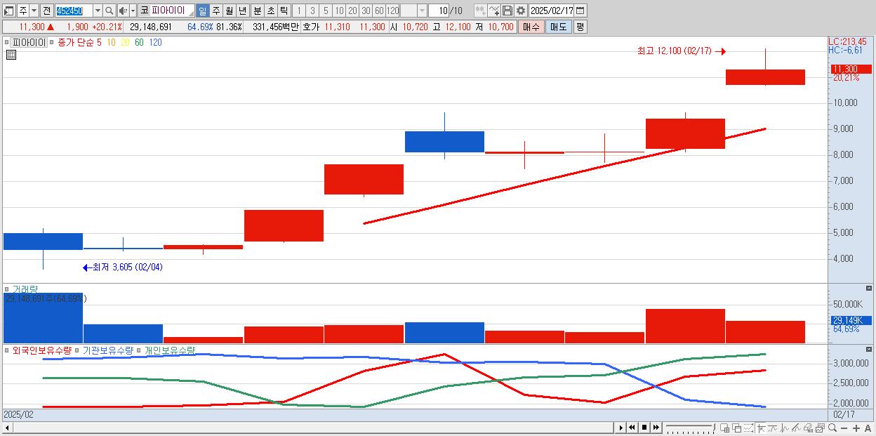 - 피아이이 (11,300원 ▲ 20.21% , 시총: 4,048억, 거래량: 29,148,691, 거래대금:3,315억)