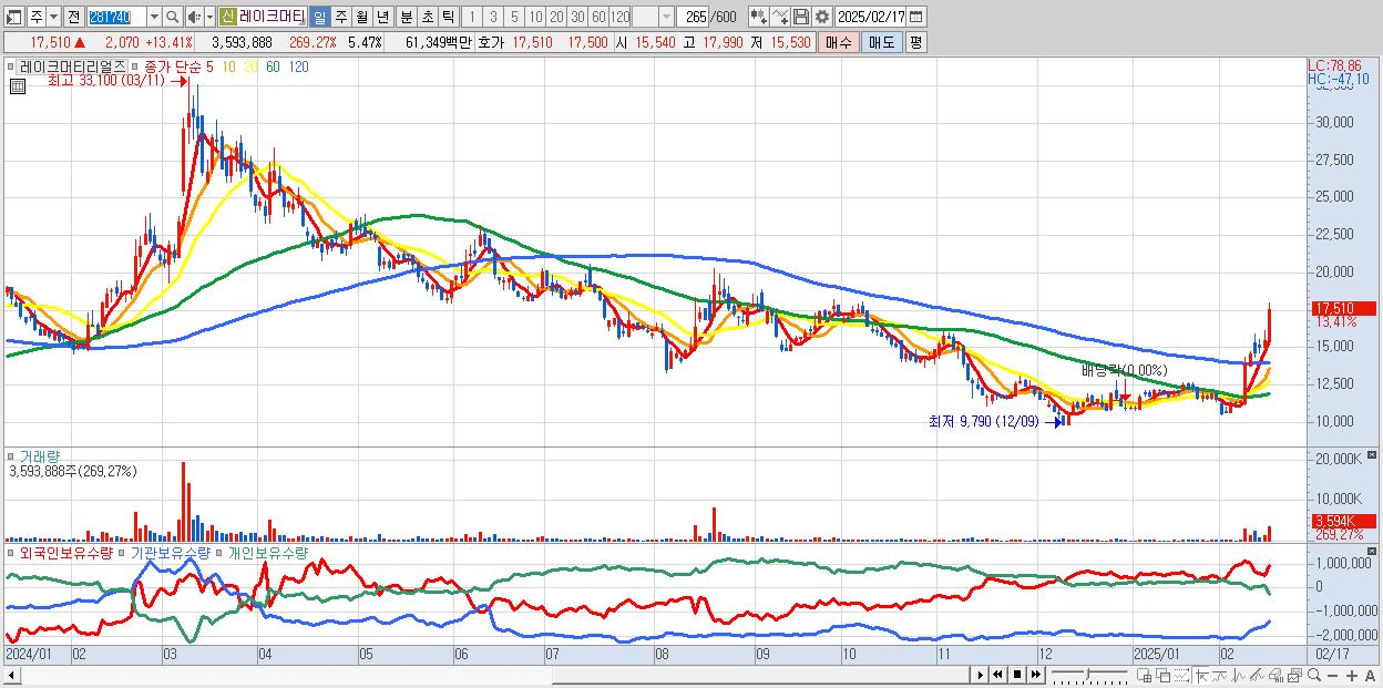 30.레이크머티리얼즈 17,510원 ▲ 13.41% (KOSDAQ, 281740)