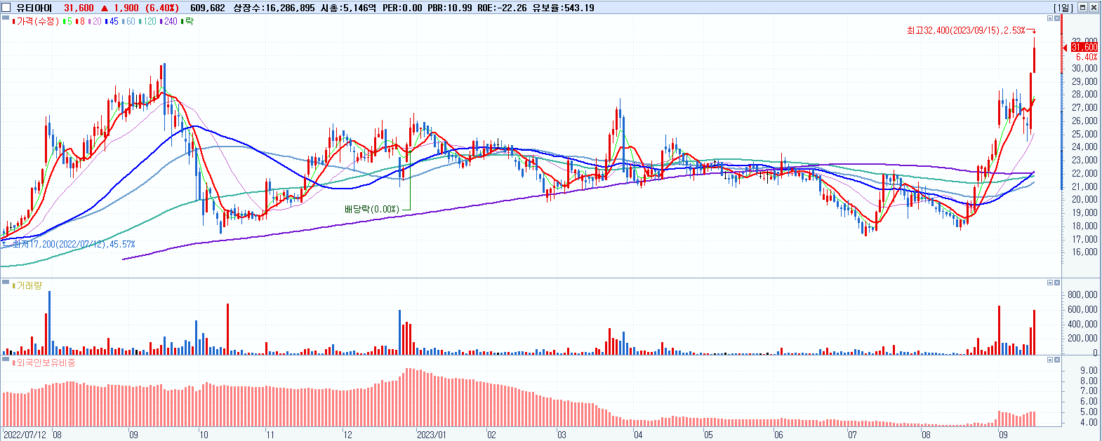 - 유티아이 (31,600원 ▲ 6.4% , 시총: 5,147억, 거래량: 610,945, 거래대금:191억, KOSDAQ)