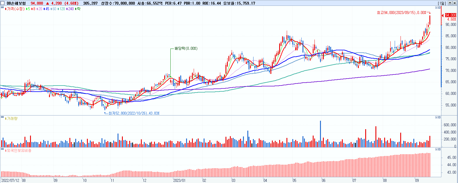 - DB손해보험 (94,000원 ▲ 4.68% , 시총: 66,552억, 거래량: 305,315, 거래대금:283억, KOSPI)