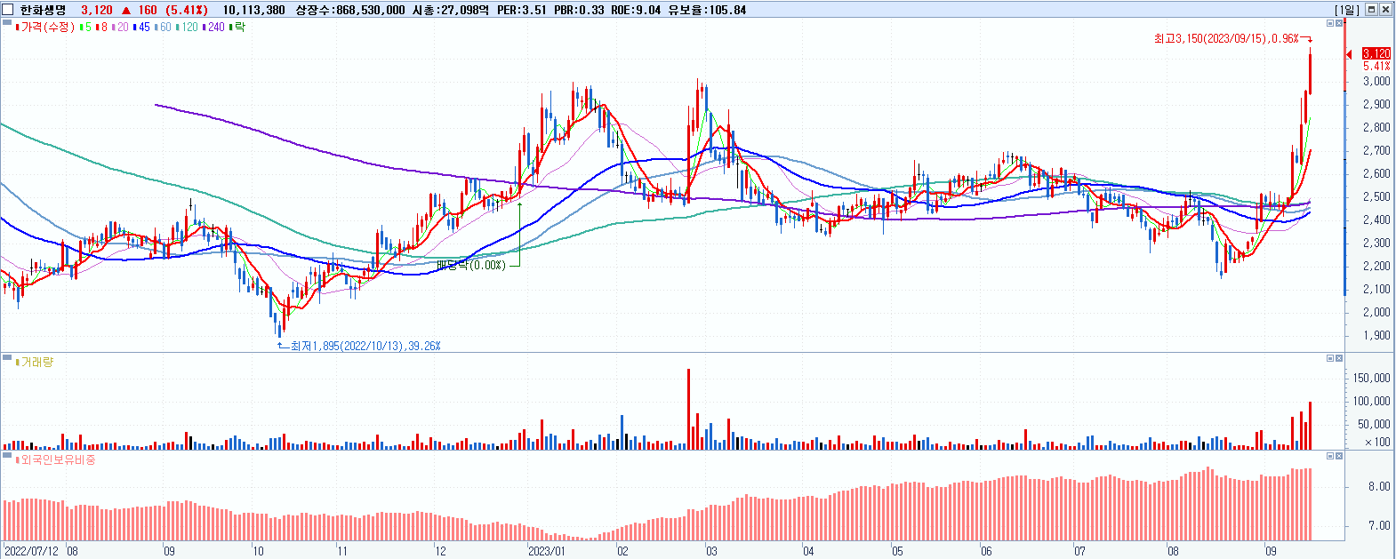 - 한화생명 (3,120원 ▲ 5.41% , 시총: 27,098억, 거래량: 10,155,836, 거래대금:315억, KOSPI)