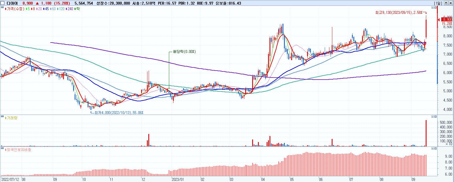 - 디아이 (8,900원 ▲ 15.28% , 시총: 2,519억, 거래량: 5,604,441, 거래대금:488억, KOSPI)