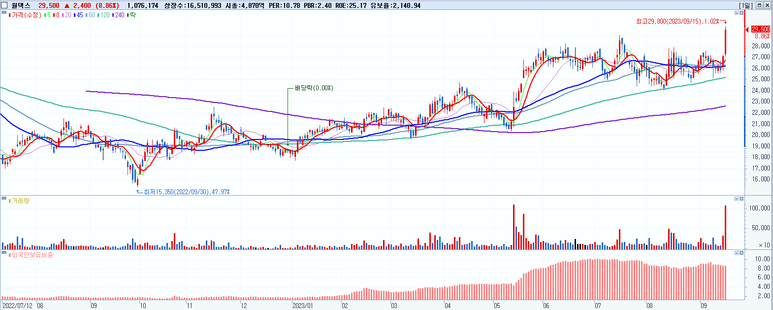 - 월덱스 (29,500원 ▲ 8.86% , 시총: 4,871억, 거래량: 1,079,837, 거래대금:312억, KOSDAQ)