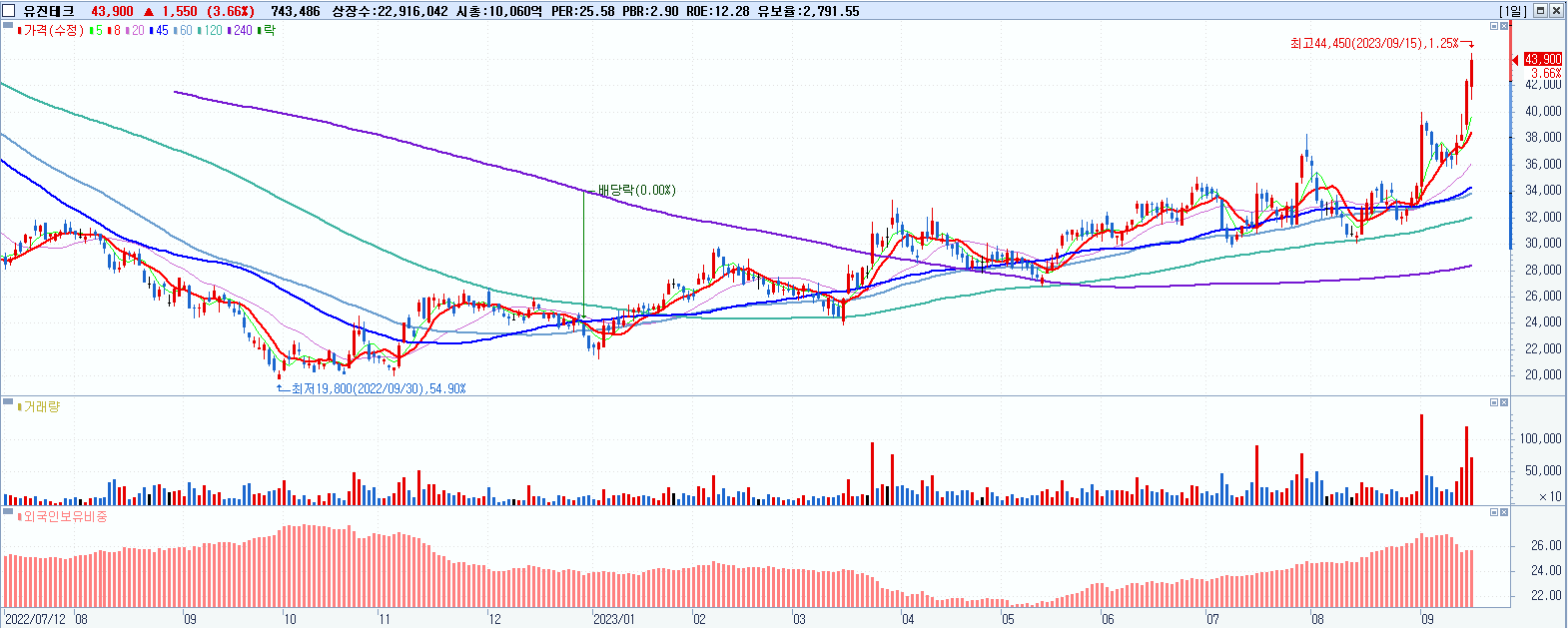 - 유진테크 (43,900원 ▲ 3.66% , 시총: 10,060억, 거래량: 746,554, 거래대금:324억, KOSDAQ)