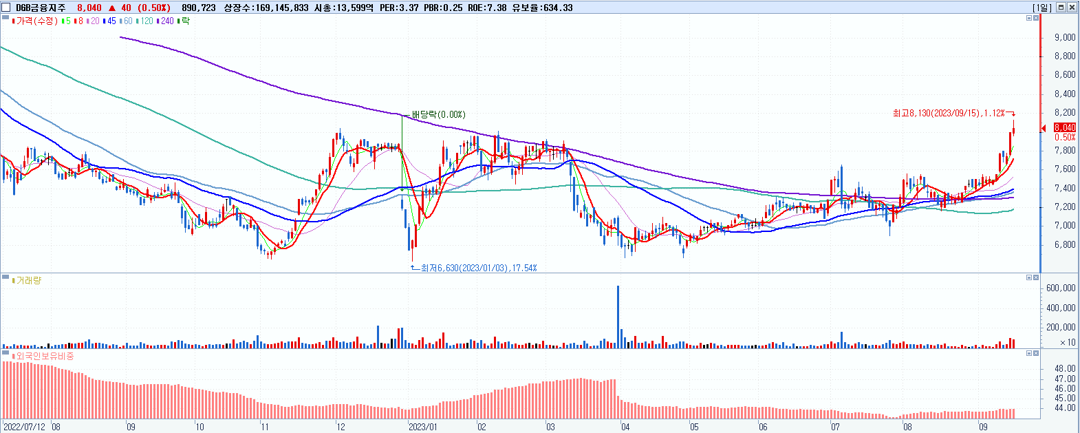 DGB금융지주 8,040원 ▲ 0.5% (KOSPI, 139130)