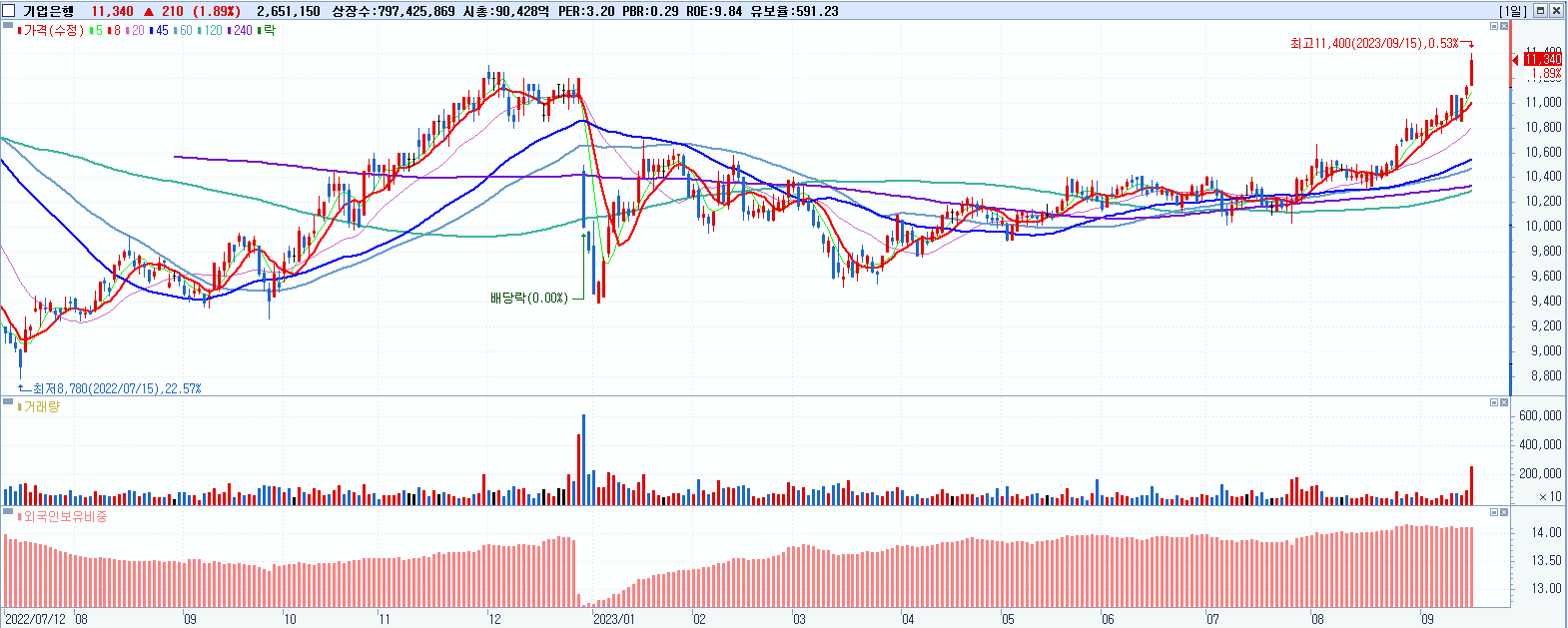 - 기업은행 (11,340원 ▲ 1.89% , 시총: 90,428억, 거래량: 2,656,754, 거래대금:301억, KOSPI)