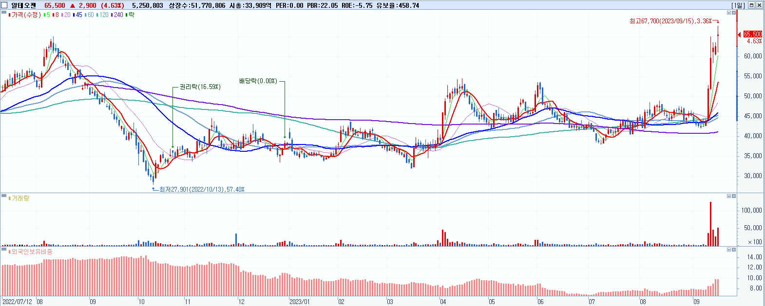 - 알테오젠 (65,500원 ▲ 4.63% , 시총: 33,910억, 거래량: 5,301,076, 거래대금:3,429억, KOSDAQ)