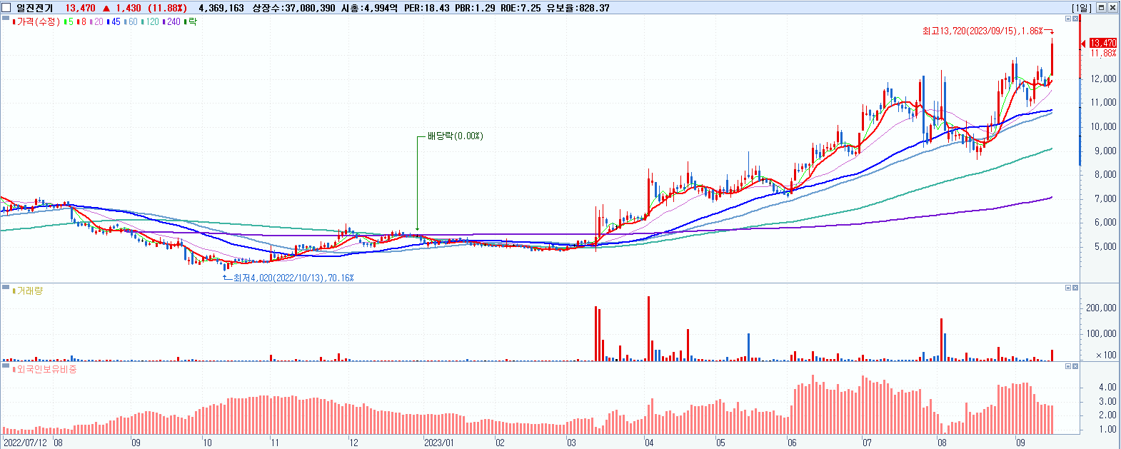 - 일진전기 (13,470원 ▲ 11.88% , 시총: 4,995억, 거래량: 4,426,046, 거래대금:583억, KOSPI)
