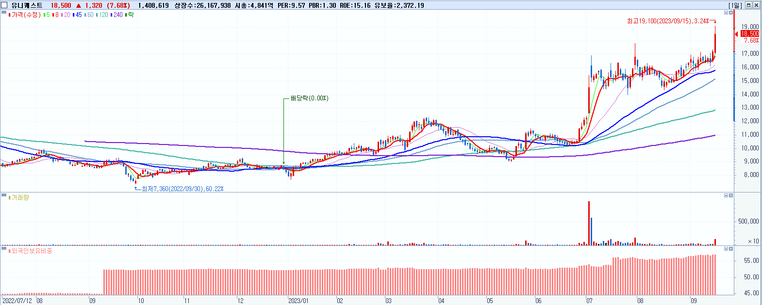 - 유니퀘스트 (18,500원 ▲ 7.68% , 시총: 4,841억, 거래량: 1,419,020, 거래대금:263억, KOSPI)