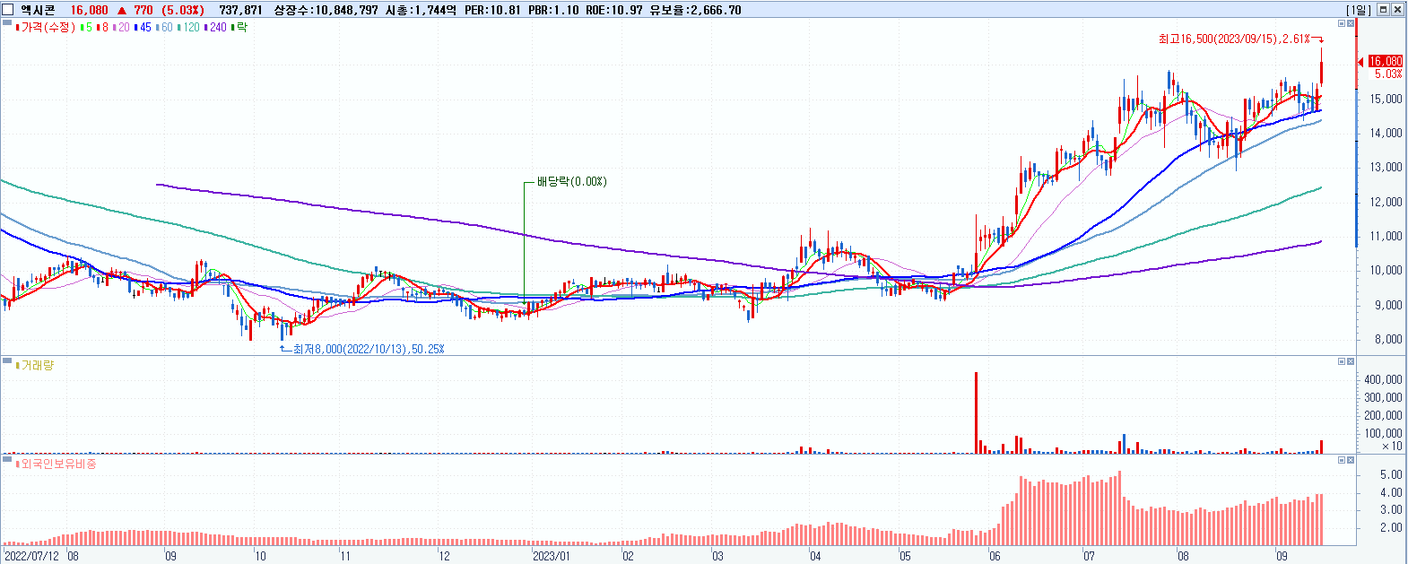 - 엑시콘 (16,080원 ▲ 5.03% , 시총: 1,744억, 거래량: 738,808, 거래대금:118억, KOSDAQ)