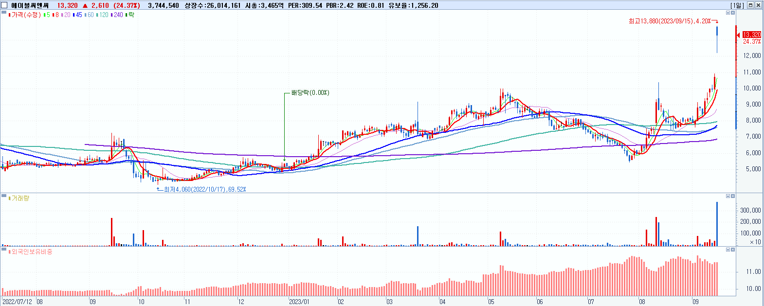 - 에이블씨엔씨 (13,320원 ▲ 24.37% , 시총: 3,465억, 거래량: 3,779,740, 거래대금:498억, KOSPI)