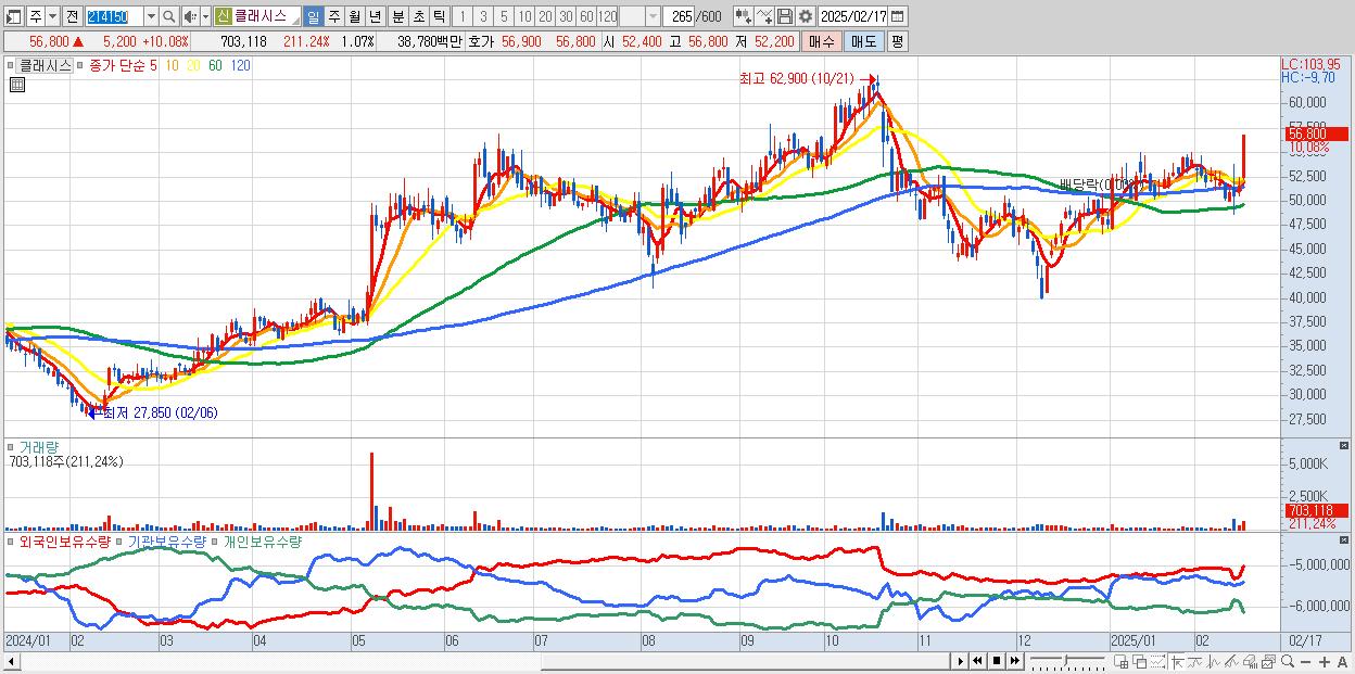 - 클래시스 (56,800원 ▲ 10.08% , 시총: 37,207억, 외국인 순매수 거래금:142억)