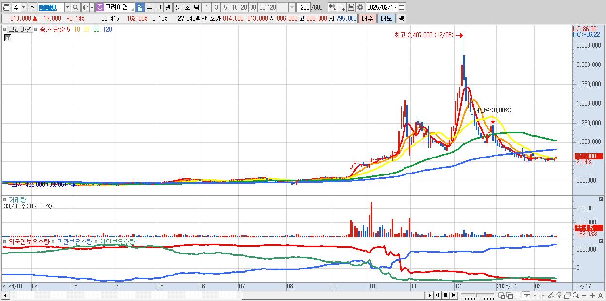 - 고려아연 (813,000원 ▲ 2.14% , 시총: 168,318억, 외국인 순매수 거래금:60억)