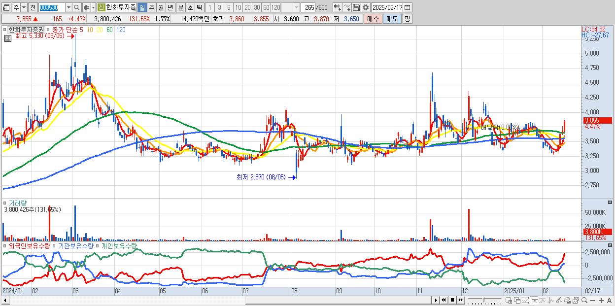 - 한화투자증권 (3,855원 ▲ 4.47% , 시총: 8,271억, 외국인 순매수 거래금:39억)