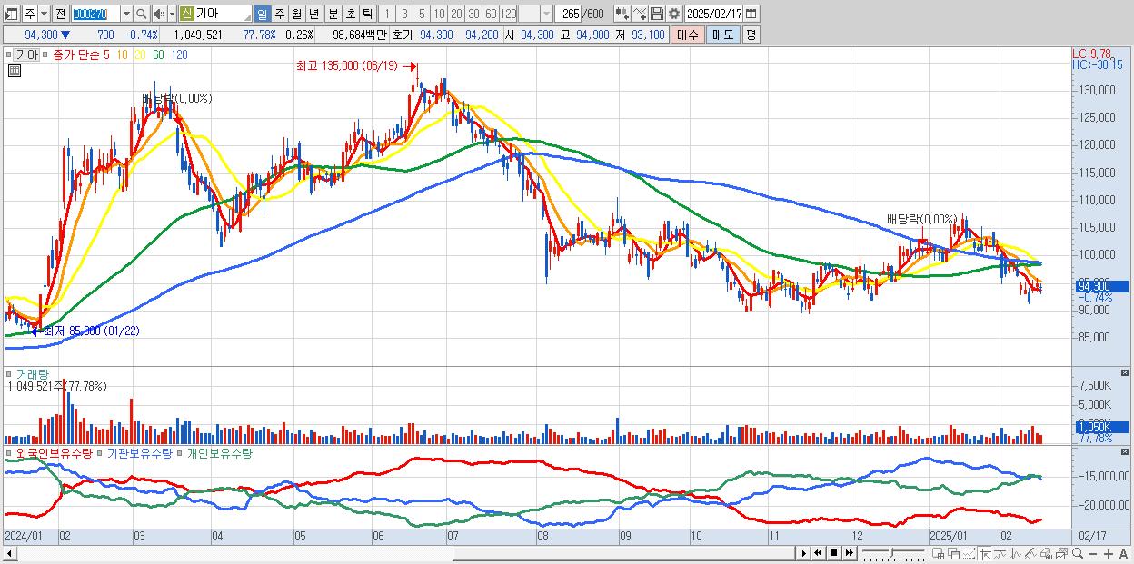 - 기아 (94,300원 ▼ -0.74% , 시총: 375,005억, 외국인 순매수 거래금:180억)