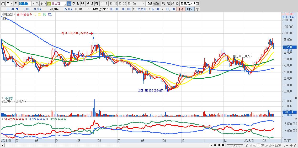 - 에스엠 (89,200원 ▼ -3.36% , 시총: 20,831억, 외국인 순매수 거래금:42억)