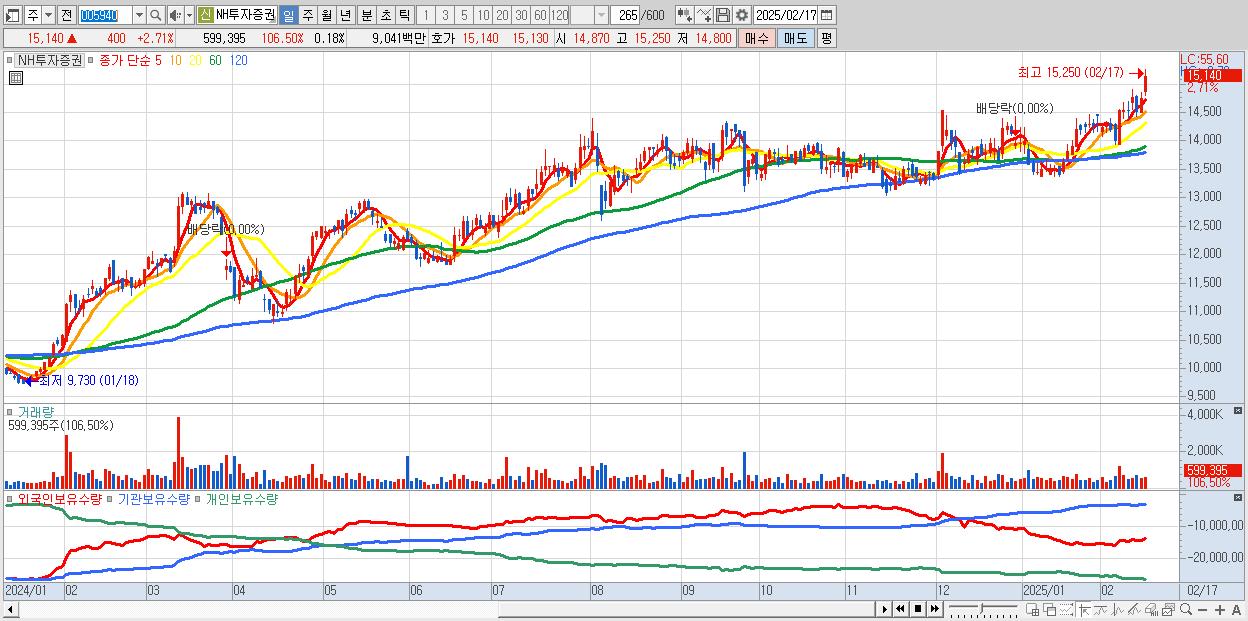 - NH투자증권 (15,140원 ▲ 2.71% , 시총: 49,582억, 거래량: 599,395, 거래대금:90억, KOSPI)