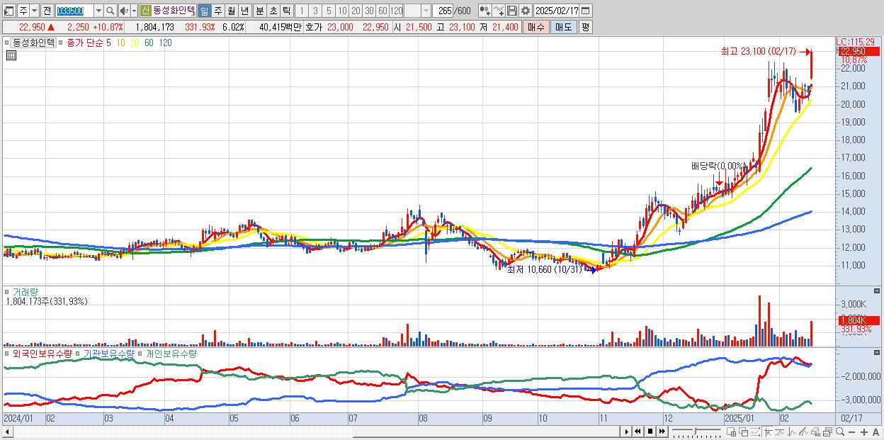- 동성화인텍 (22,950원 ▲ 10.87% , 시총: 6,883억, 거래량: 1,804,173, 거래대금:404억, KOSDAQ)