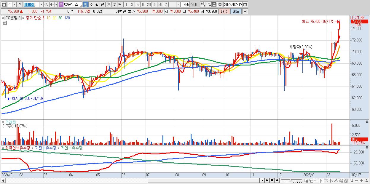 - CS홀딩스 (75,200원 ▲ 1.76% , 시총: 868억, 거래량: 817, 거래대금:1억, KOSPI)