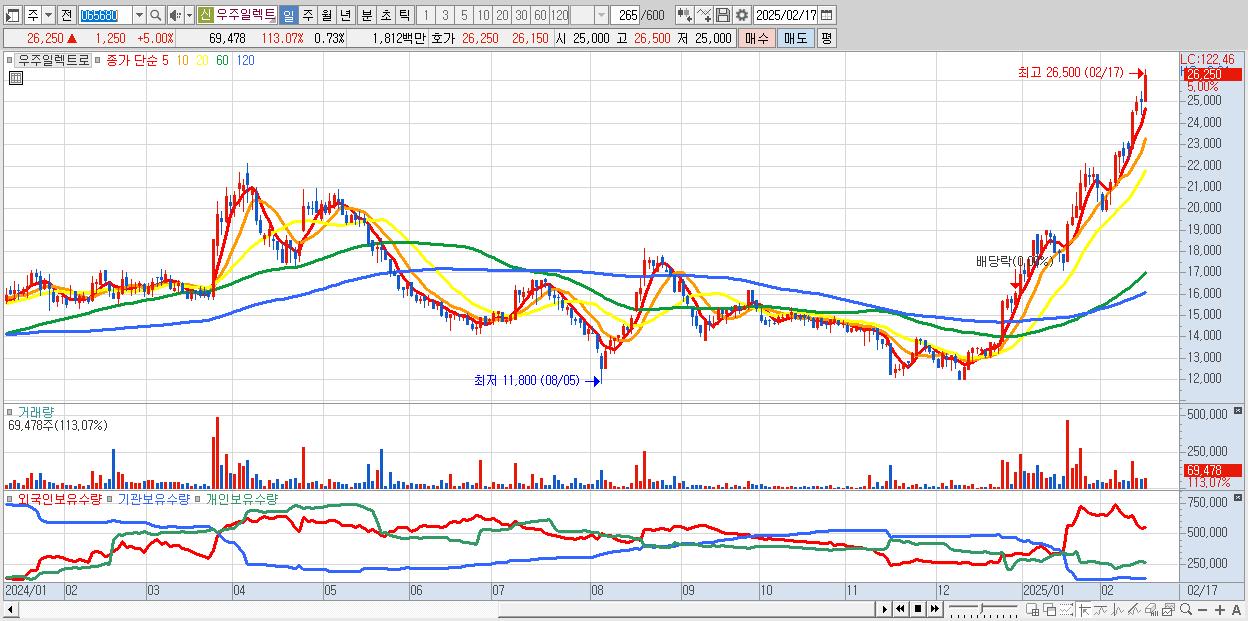 - 우주일렉트로 (26,250원 ▲ 5% , 시총: 2,502억, 거래량: 69,478, 거래대금:18억, KOSDAQ)