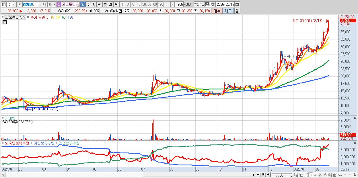 - 코오롱티슈진 (38,900원 ▲ 7.91% , 시총: 31,676억, 거래량: 649,820, 거래대금:248억, KOSDAQ)
