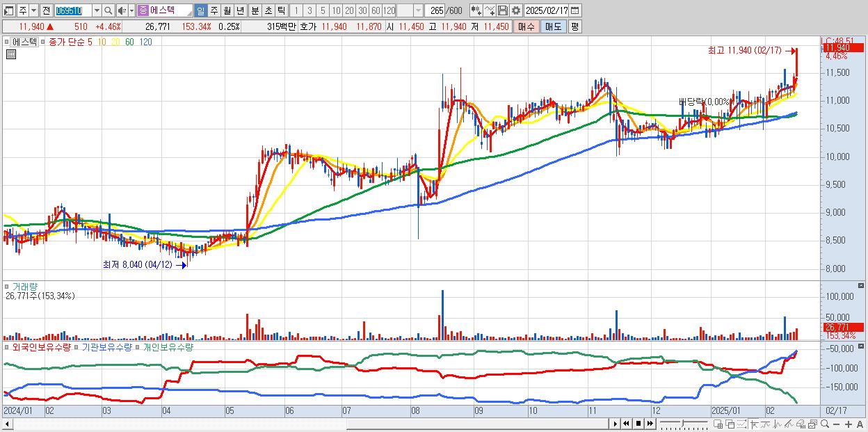 - 에스텍 (11,940원 ▲ 4.46% , 시총: 1,303억, 거래량: 26,771, 거래대금:3억, KOSDAQ)