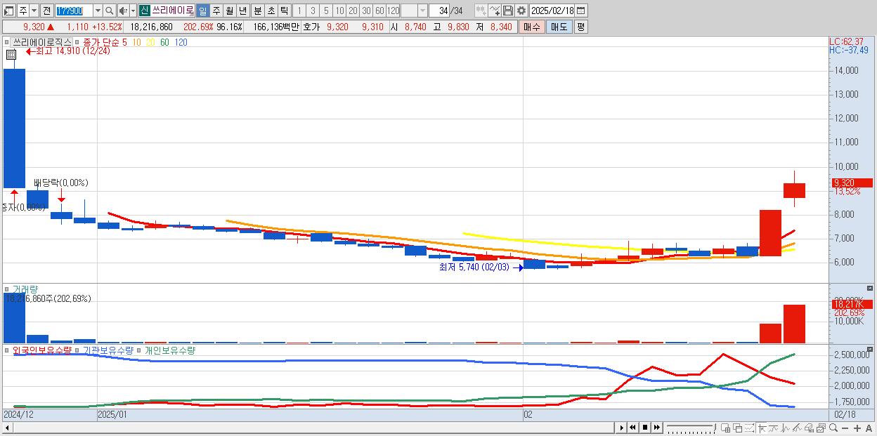 - 쓰리에이로직스 (9,320원 ▲ 13.52% , 시총: 866억, 거래량: 18,216,860, 거래대금:1,661억)