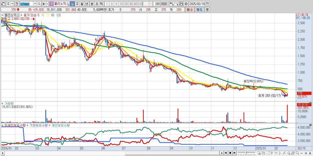 - 클리노믹스 (370원 ▲ 29.82% , 시총: 144억, 거래량: 15,911,038, 거래대금:56억)