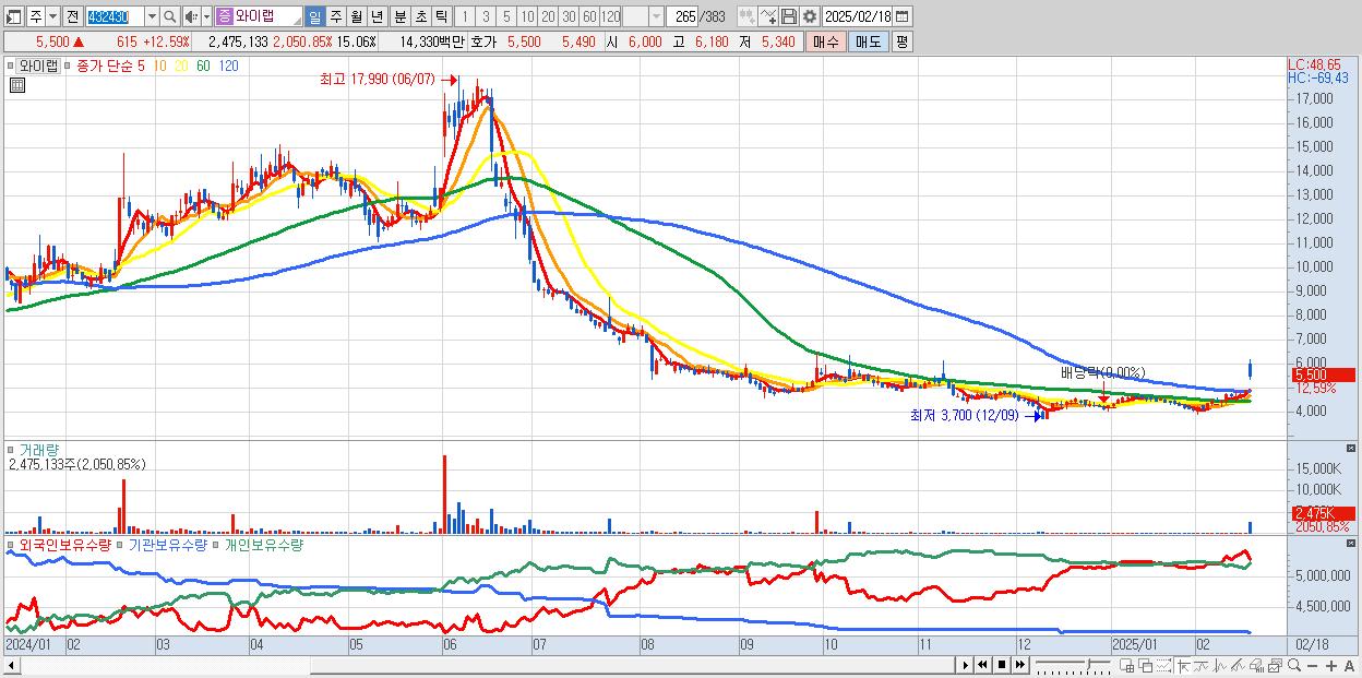 - 와이랩 (5,500원 ▲ 12.59% , 시총: 904억, 거래량: 2,475,133, 거래대금:143억)