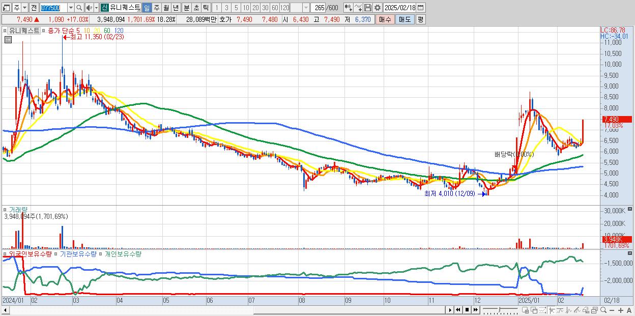 - 유니퀘스트 (7,490원 ▲ 17.03% , 시총: 1,618억, 거래량: 3,948,094, 거래대금:281억)