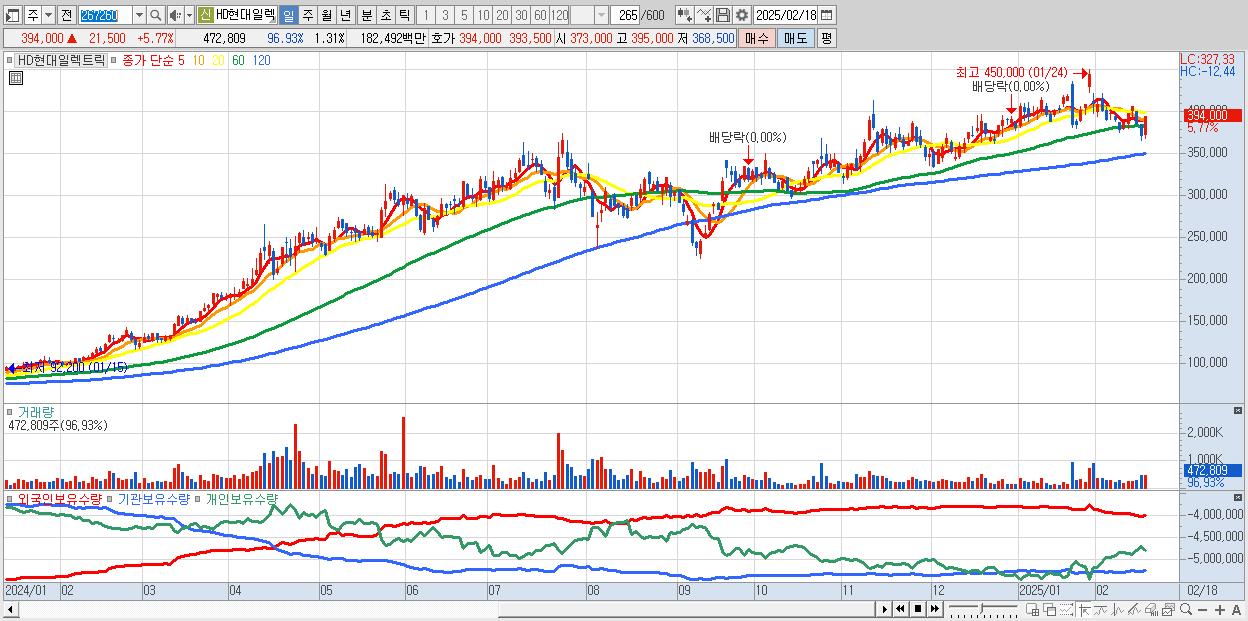 - HD현대일렉트릭 (394,000원 ▲ 5.77% , 시총: 142,026억, 외국인 순매수 거래금:234억)