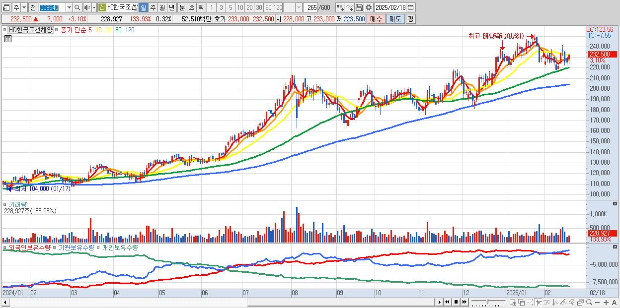 - HD한국조선해양 (232,500원 ▲ 3.1% , 시총: 164,547억, 외국인 순매수 거래금:90억)