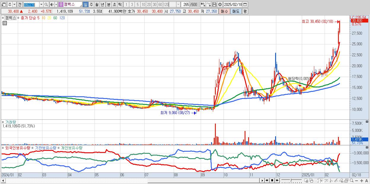 - 젬백스 (30,400원 ▲ 8.57% , 시총: 12,158억, 외국인 순매수 거래금:43억)