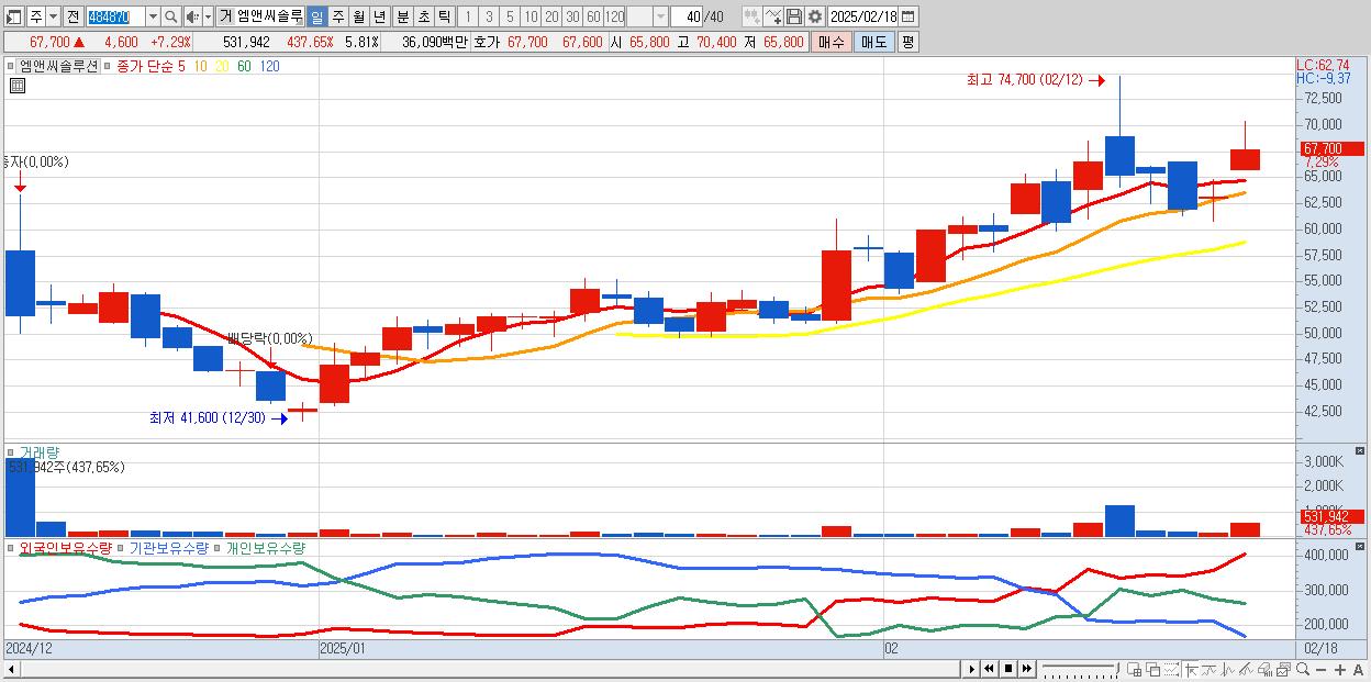 - 엠앤씨솔루션 (67,700원 ▲ 7.29% , 시총: 6,197억, 외국인 순매수 거래금:48억)