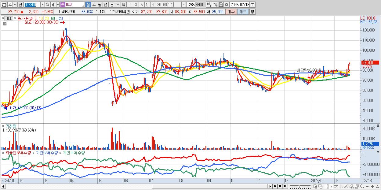 - HLB (87,700원 ▲ 2.69% , 시총: 115,227억, 외국인 순매수 거래금:94억)