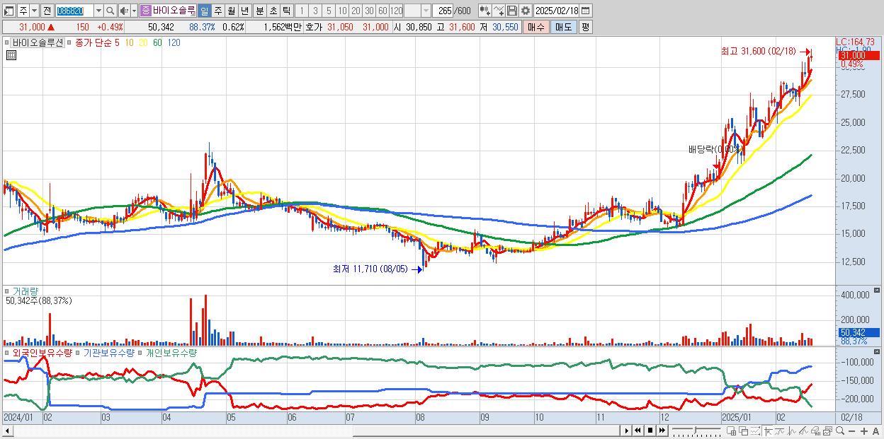 - 바이오솔루션 (31,000원 ▲ 0.49% , 시총: 2,524억, 거래량: 50,342, 거래대금:16억, KOSDAQ)
