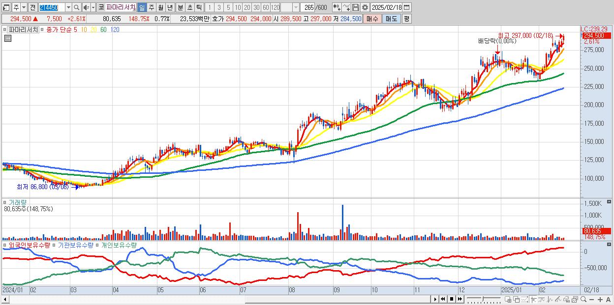 - 파마리서치 (294,500원 ▲ 2.61% , 시총: 30,951억, 거래량: 80,635, 거래대금:235억, KOSDAQ)