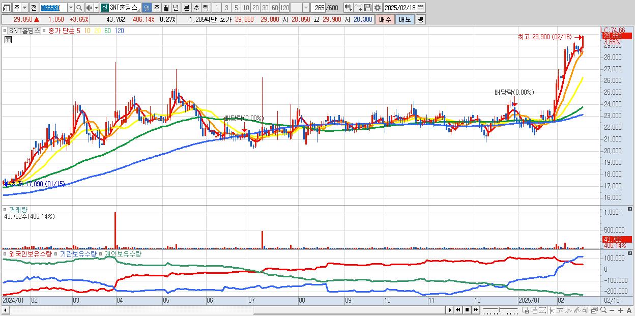 - SNT홀딩스 (29,850원 ▲ 3.65% , 시총: 4,867억, 거래량: 43,762, 거래대금:13억, KOSPI)