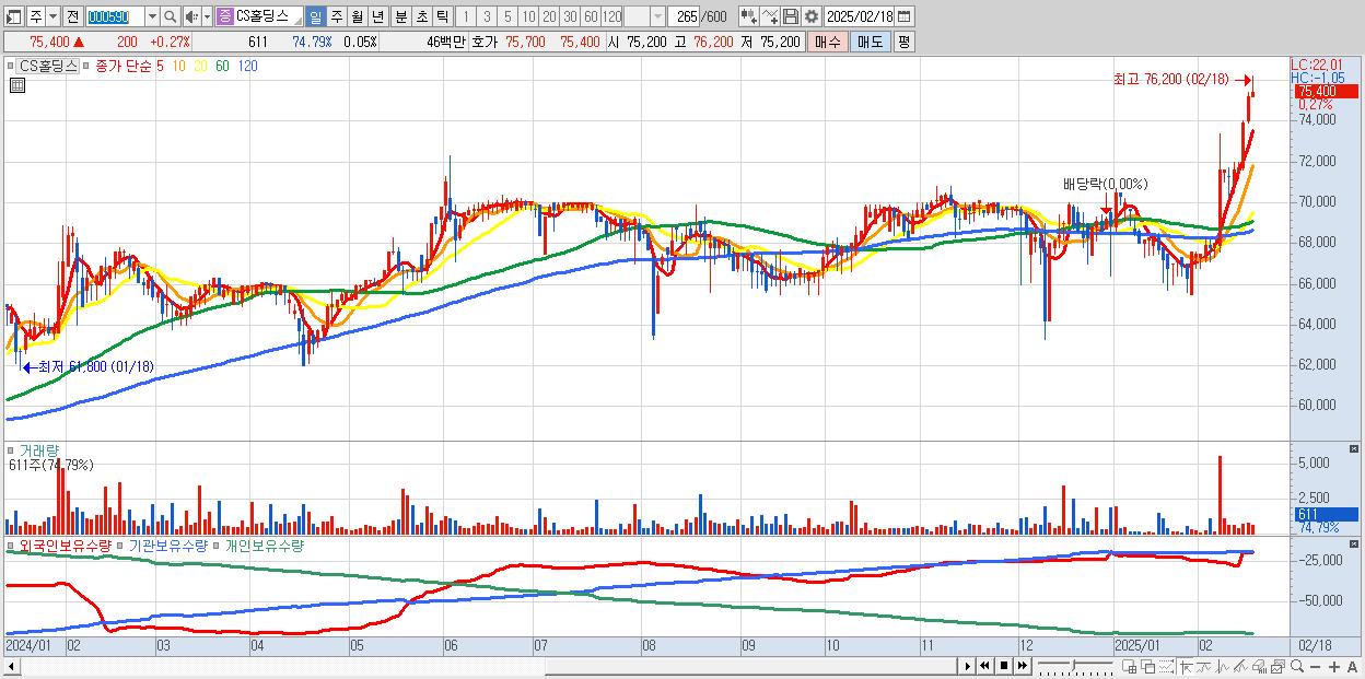 CS홀딩스 75,400원 ▲ 0.27% (KOSPI, 000590)