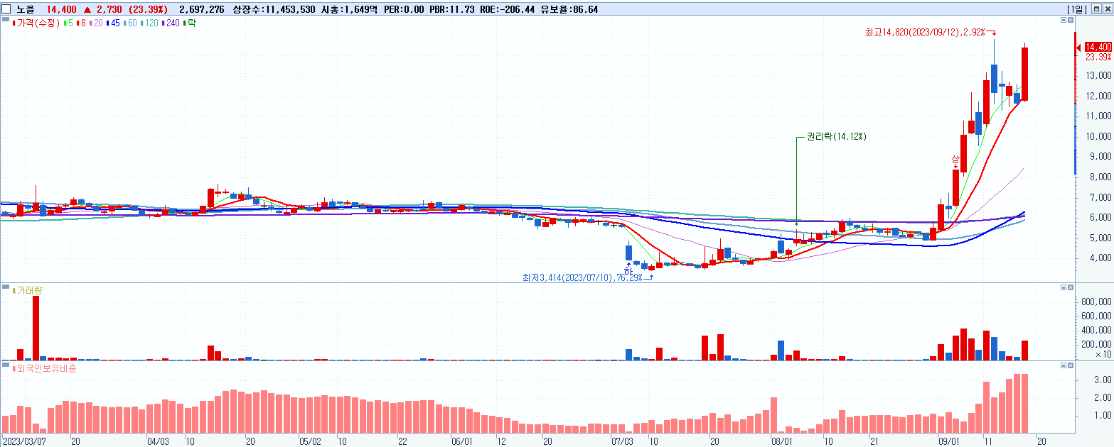 - 노을 (14,400원 ▲ 23.39% , 시총: 1,649억, 거래량: 2,699,534, 거래대금:364억)
