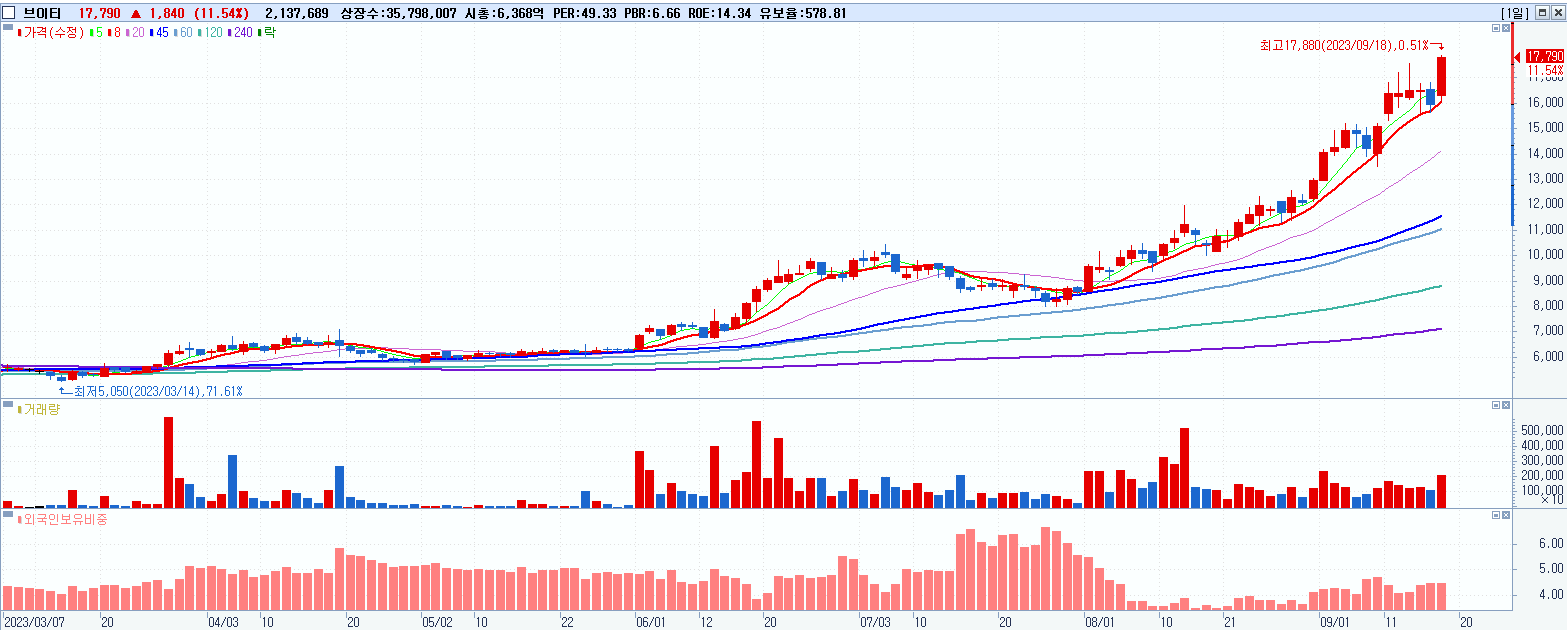- 브이티 (17,790원 ▲ 11.54% , 시총: 6,368억, 거래량: 2,142,295, 거래대금:364억)