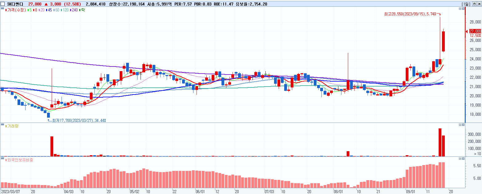 - SK디앤디 (27,000원 ▲ 12.5% , 시총: 5,991억, 거래량: 2,891,496, 거래대금:757억)