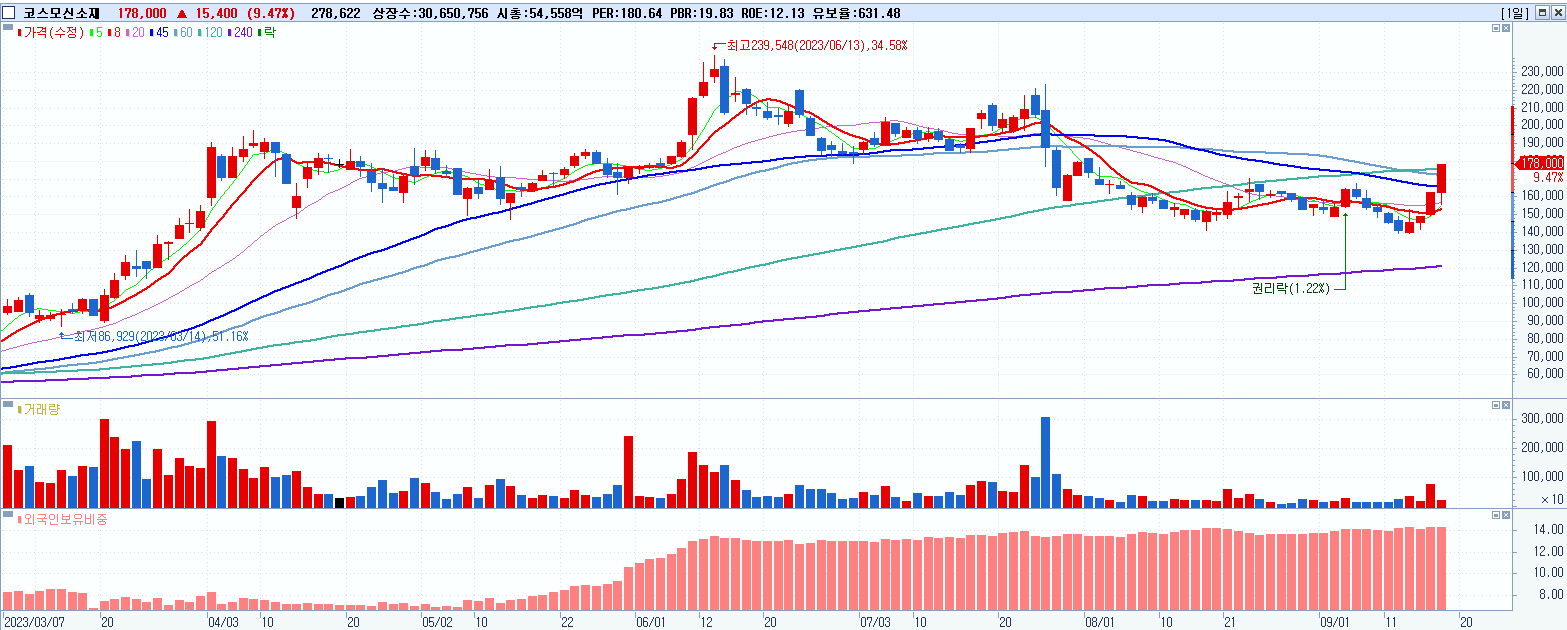 - 코스모신소재 (178,000원 ▲ 9.47% , 시총: 54,558억, 거래량: 287,324, 거래대금:469억)