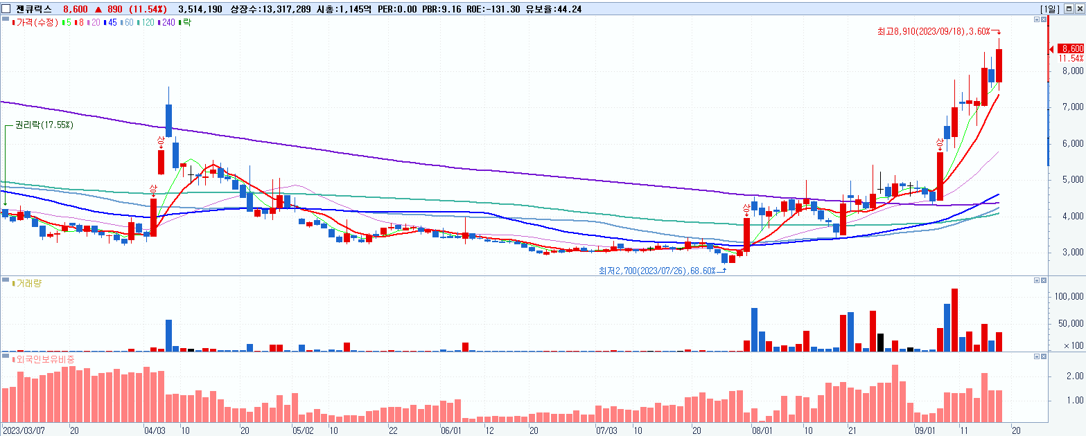 - 젠큐릭스 (8,600원 ▲ 11.54% , 시총: 1,145억, 거래량: 3,516,710, 거래대금:294억)