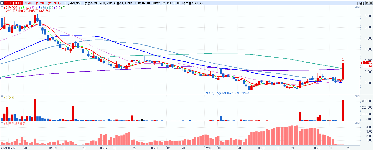 - 모아데이타 (3,405원 ▲ 29.96% , 시총: 1,139억, 거래량: 31,809,757, 거래대금:1,014억)