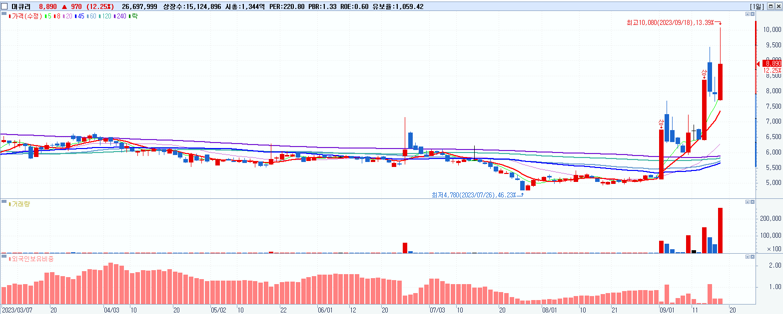 시총: 1,139억 거래량: 31,809,757 거래대금:1,014억