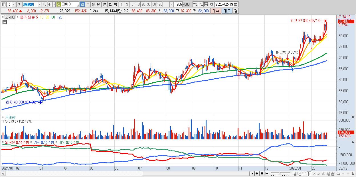 - 코웨이 (86,400원 ▲ 2.37% , 시총: 62,695억, 거래량: 176,079, 거래대금:151억, KOSPI)