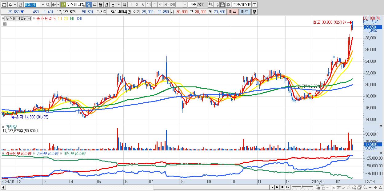 - 두산에너빌리티 (29,850원 ▼ -1.49% , 시총: 191,208억, 거래량: 17,987,673, 거래대금:5,424억)