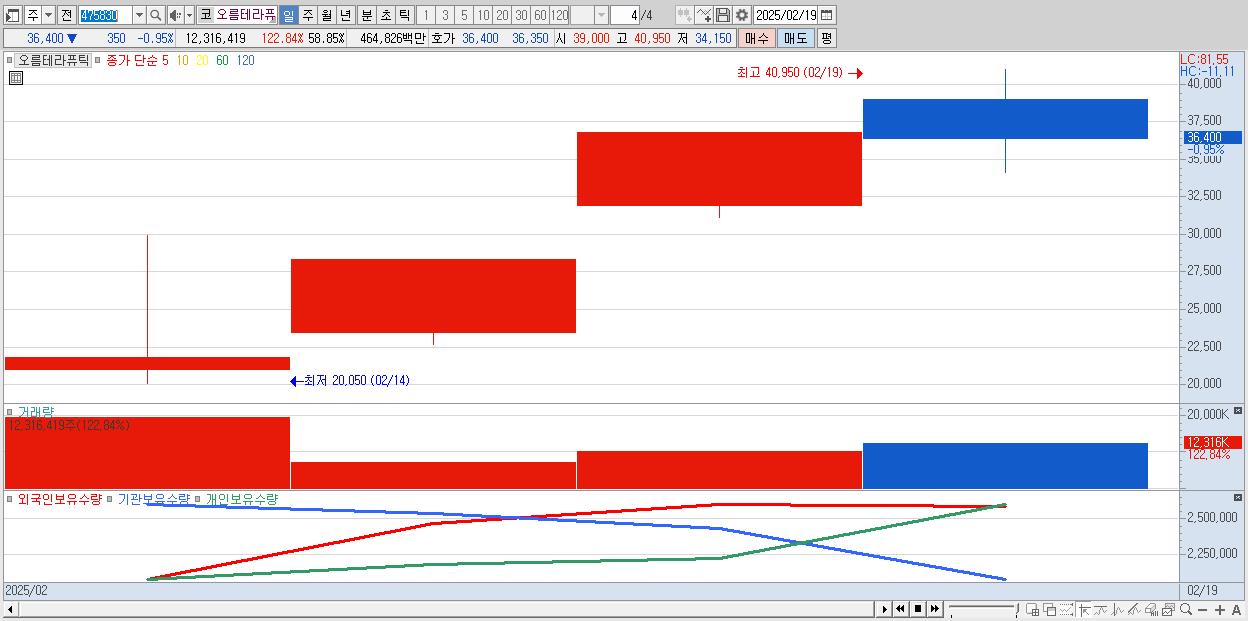 - 오름테라퓨틱 (36,400원 ▼ -0.95% , 시총: 7,618억, 거래량: 12,316,419, 거래대금:4,648억)