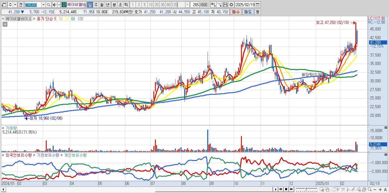 - 에이비엘바이오 (41,200원 ▼ -12.15% , 시총: 19,892억, 거래량: 5,214,445, 거래대금:2,196억)
